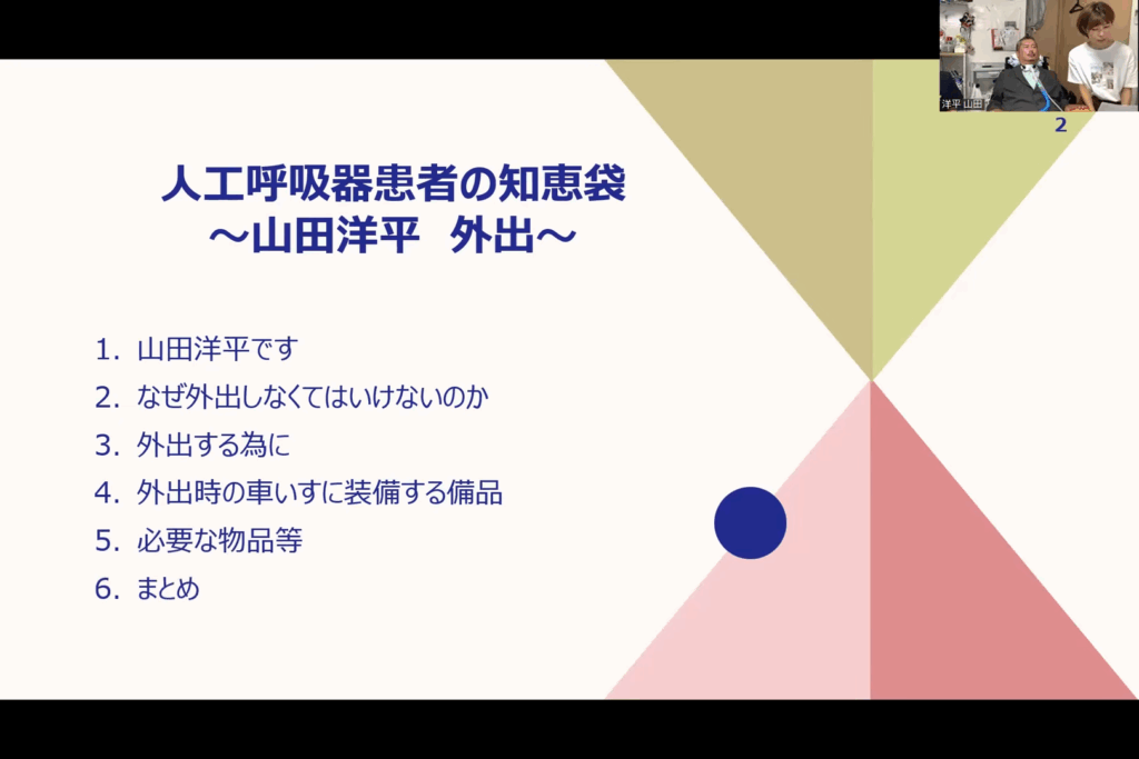 要約 ALS歴11年の山田洋平氏が語る日常生活と外出札幌市在住、ALS歴11年、人工呼吸器使用歴8年の山田氏は、重度訪問介護を利用しながら日々自由に外出する生活…